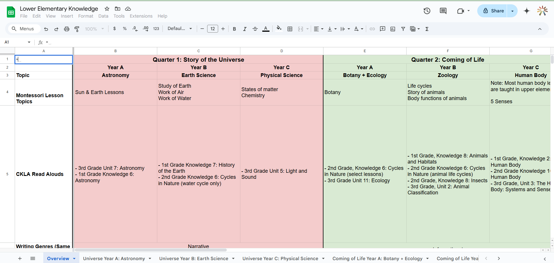 A detailed Scope and Sequence that includes all content from the Amplify CKLA curriculum kindergarten through 3rd grade aligned to Montessori lessons and pedagogy
