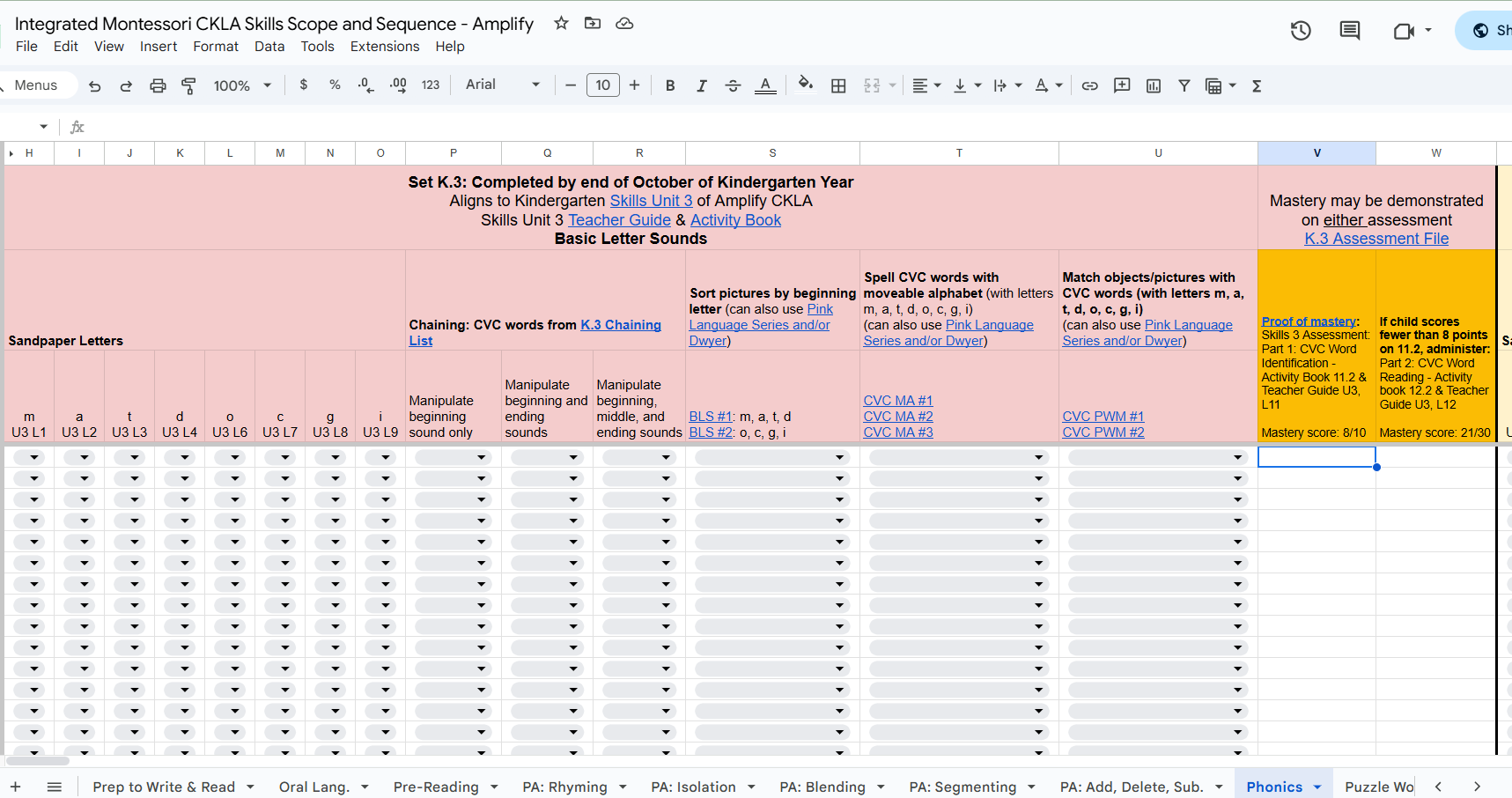 Now that you know what skills are taught in the traditional curriculum, you can align them to the Montessori materials that are already in your school. We found it helpful to document the specific materials that could be used to teach and practice each skill. See the sample of our Amplify CKLA scope and sequence map for examples.