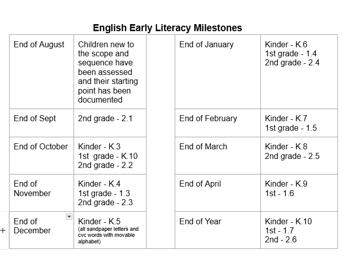 For example, our milestone to know the sounds for all of the lower case sandpaper letters and spell CVC words with the movable alphabet is December of kindergarten. The majority of children in Montessori classrooms will acquire these skills well before the middle of their kindergarten year. For those who don't, the milestones help us understand when to seek additional support.