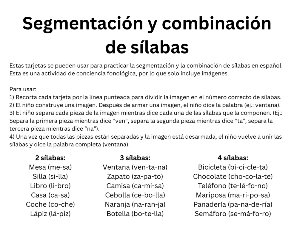 Estas tarjetas se pueden usar para practicar la segmentación y la combinación de sílabas en español. Esta es una actividad de conciencia fonológica, por lo que solo incluye imágenes. Se incluyen 18 palabras: 8 con dos sílabas, 8 con tres sílabas y 8 con cuatro sílabas.