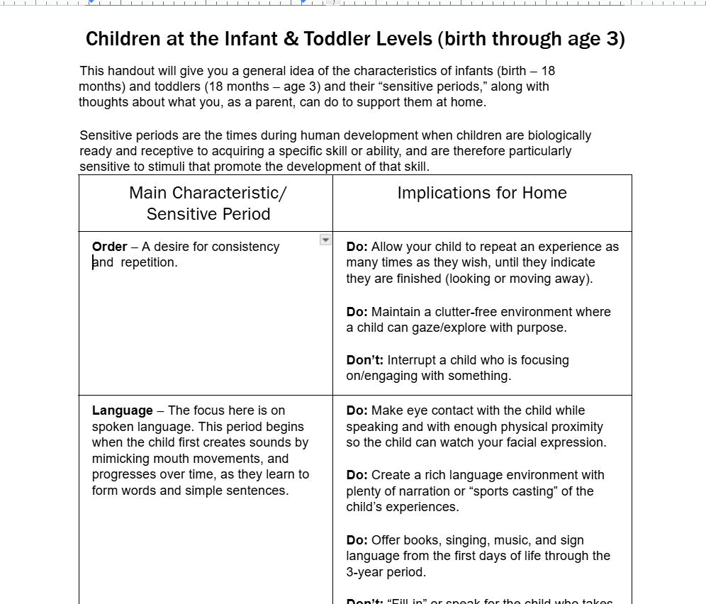 This handout from the American Montessori Society explains common characteristics of infants (birth – 18 months) and toddlers (18 months – age 3) and their “sensitive periods,” along with thoughts about what you, as a parent/caregiver, can do to support them at home. This download includes versions in English, Spanish, and Vietnamese.